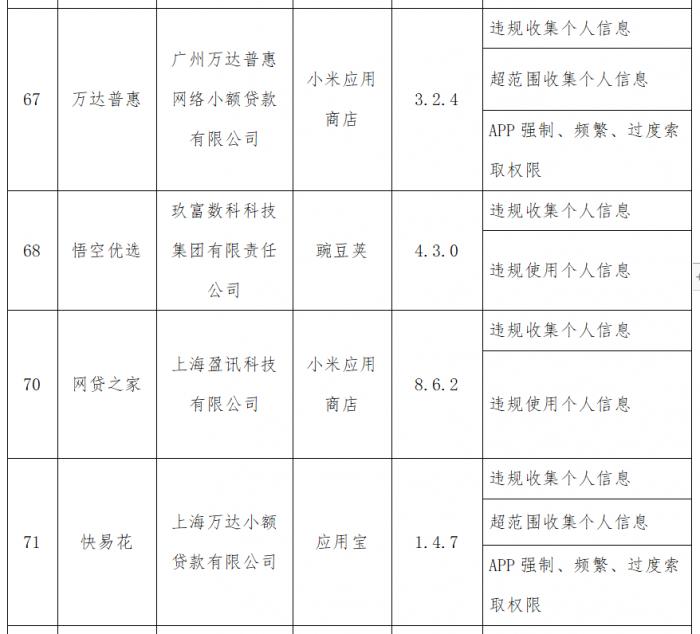 万达普惠、快易花、悟空优选等多家网贷APP在列,网贷行业的门户网站网贷之家也被点名。违规收集和使用个人信息、超范围收集个人信息以及APP强制、频繁、过度索取权限等成为这些APP的主要侵权行为。