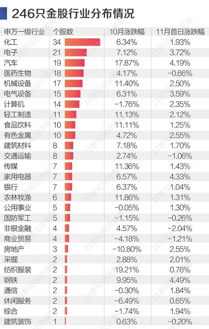 此外,电子行业涉及的21只金股,在10月收获平均7.12%的涨幅,并在11月2日平均上涨3.72%。也属于上涨动能相对强势的行业。