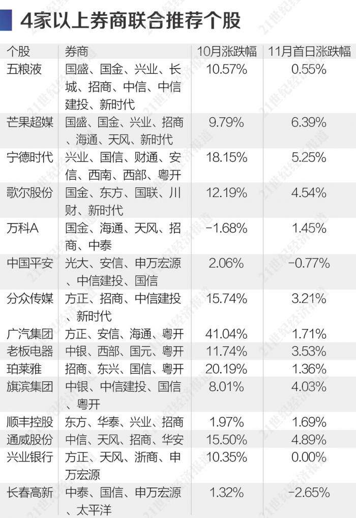 据21世纪资本研究院跟踪了解,各家券商也在近几日发布了11月金股。