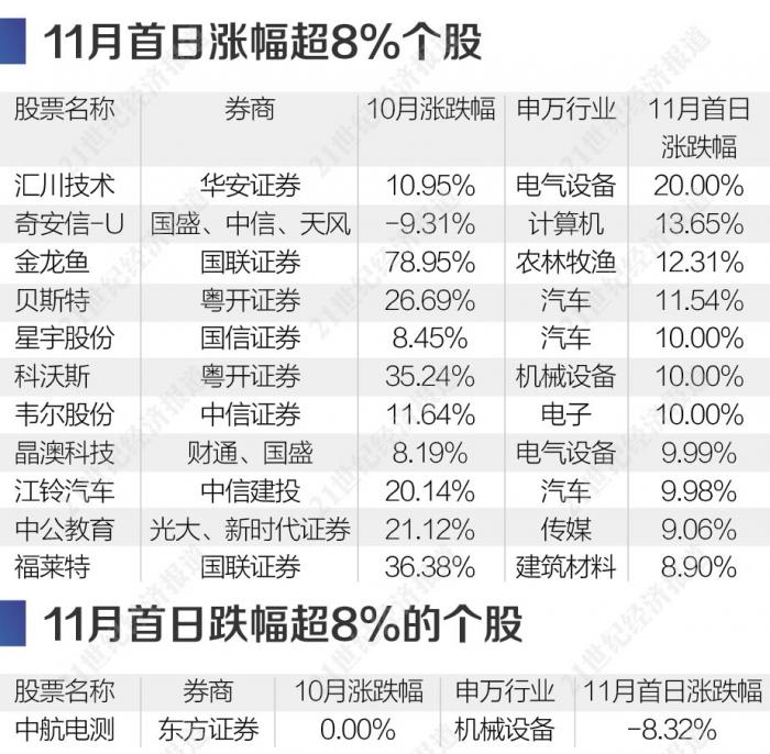 从11月的首个交易日的表现结果来看,已经有6只个股出现涨停,涨幅最大的个股汇川技术(11月2日)以20%的涨幅封板。