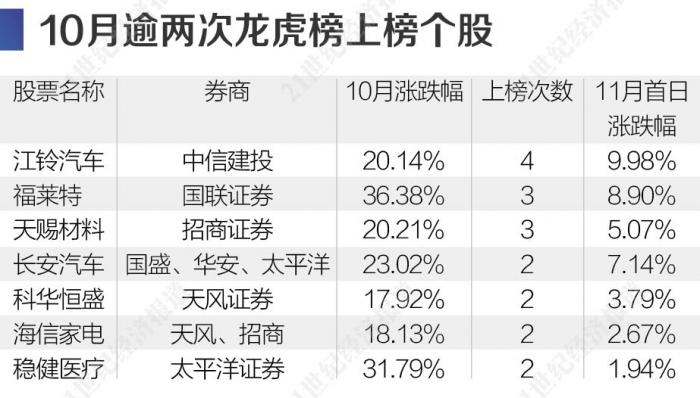 11月的各家券商金股中,上月上龙虎榜超过2次的金股,仅有7只。相比前几个月,上榜金股少了很多。