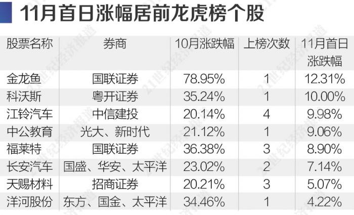 此外,11月2日涨幅超过8%的金股具有的共性是,几乎都在10月维持强势的涨势——例如次新股金龙鱼,10月上涨78.95%,11月首个交易日上涨12.31%;