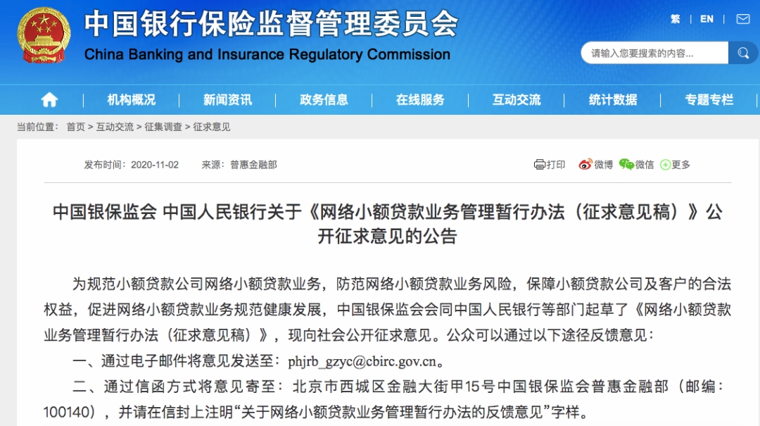 11月2日,为规范小额贷款公司网络小额贷款(以下简称“网络小贷”)业务,统一监管规则和经营规则,促进网络小额贷款业务规范健康发展,银保监会会同央行等部门起草了《网络小额贷款业务管理暂行办法(征求意见稿)》(以下简称《办法》),并向社会公开征求意见。