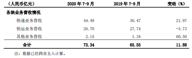 德邦主营业务由快运、快递两项业务组成,前三季度这两项业务的总收入占比达到97.21%。其中,快运是德邦的起家业务,快递则是其转型业务