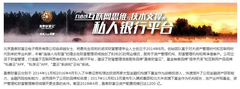 据悉,盈泰财富云创立于2014年,创始人为梁越和杨勇, 是少数以自营产品为主的财富平台。官网信息显示,梁越曾任中融信托副总裁、恒天财富创始人,截至2018年4月,盈泰财富云资产配置规模已达1200 亿元。