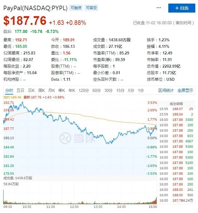 美东时间11月2日盘后,美国支付公司PayPal发布了2020财年三季度的财务报告,财报显示营收净利均超预期,但公司高层预计四季度利润将低于预期,导致该公司股价在盘后交易中跌超6%。截至美股研究社发稿,PayPal周一盘后报177.00美元,总市值为2202.99亿美元。