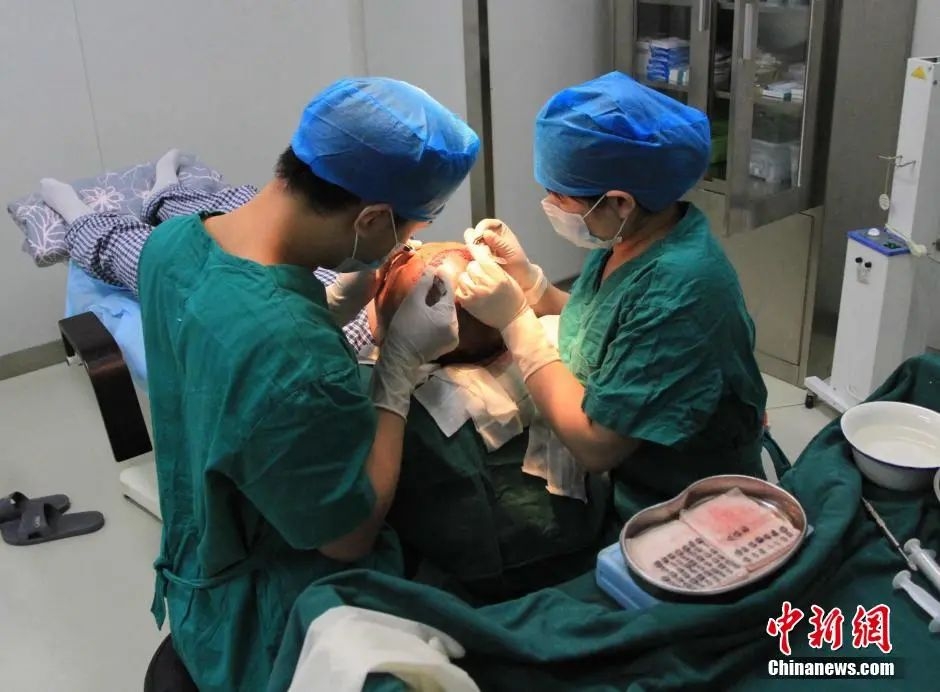 北京永和植发中心,一名患者正在接受植发手术。图片来源:中新网 中新社 潘旭临 摄