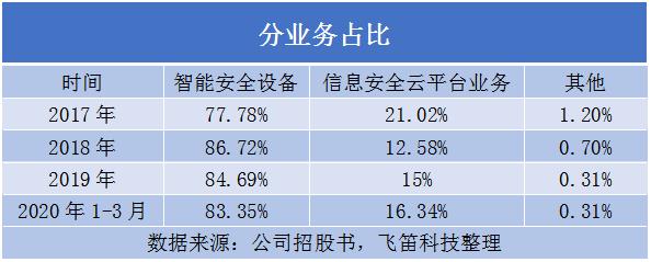从营收结构来看,公司营业收入主要包括智能安全设备收入、信息安全云平台业务收入及其他收入。报告期内,智能安全设备销售收入占公司营收比例在75%以上,是公司收入的主要来源,信息安全云平台业务的占比在15%左右,其他业务的收入占比已不足1%。