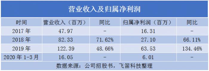 先来看公司整体的营收和净利润情况。从最新的年度数据来看,公司2019年实现营业收入1.22亿元,同比增长48.66%,增速较快,但较2018年增速有所放缓。同期归属净利润为6353万元,同比大幅增长134.46%,远超营收增速。