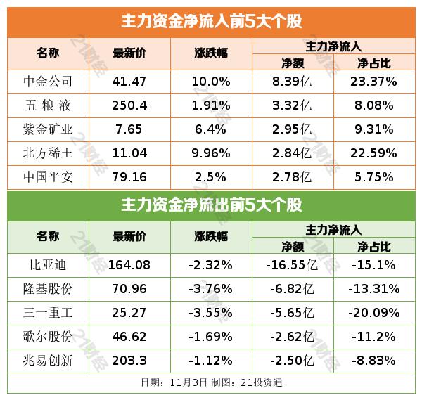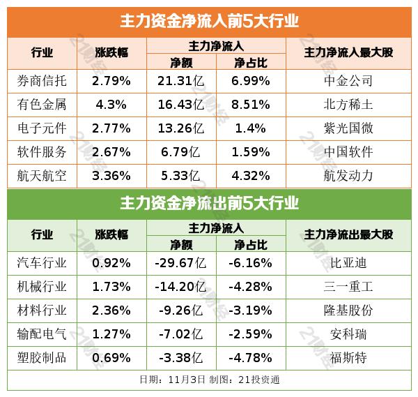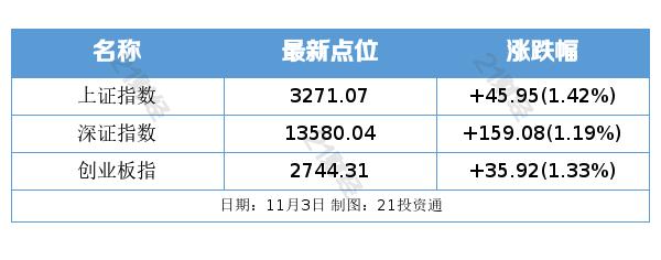 11月3日,A股三大指数集体收涨,两市合计成交7847.39亿。第三代半导体、有色、稀土永磁等板块涨幅居前,仅汽车整车、啤酒板块收绿。