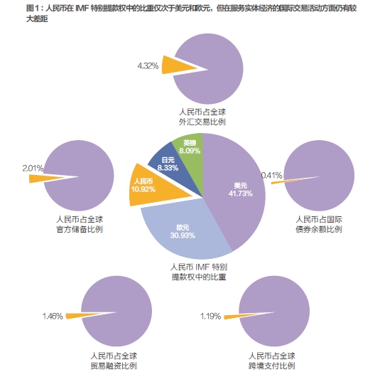 相比于我国实体经济的发展和开放程度而言,我国走向浮动汇率的步伐、资本市场的开放和人民币国际化的进程相当滞后。虽然我国已经具备灵活汇率制度和人民币国际化的宏观基础和条件,而且人民币在特别提款权中的比重也被定为10.92%,但人民币与美元、欧元、英镑和日元等全球货币相比,在服务实体经济的国际交易活动方面存在较大差距。目前,人民币仅占全球官方储备的2.01%、外汇交易的4.32%、国际债券余额的0.41%、跨境支付的1.19%,贸易融资的1.46%。