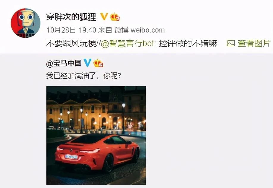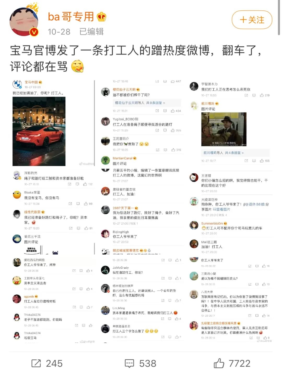 10月27日上午,@宝马中国 发布了一条微博,“我加满油了,你呢?打工人”,随后很快又重新编辑,将最后三个字“打工人”删去。