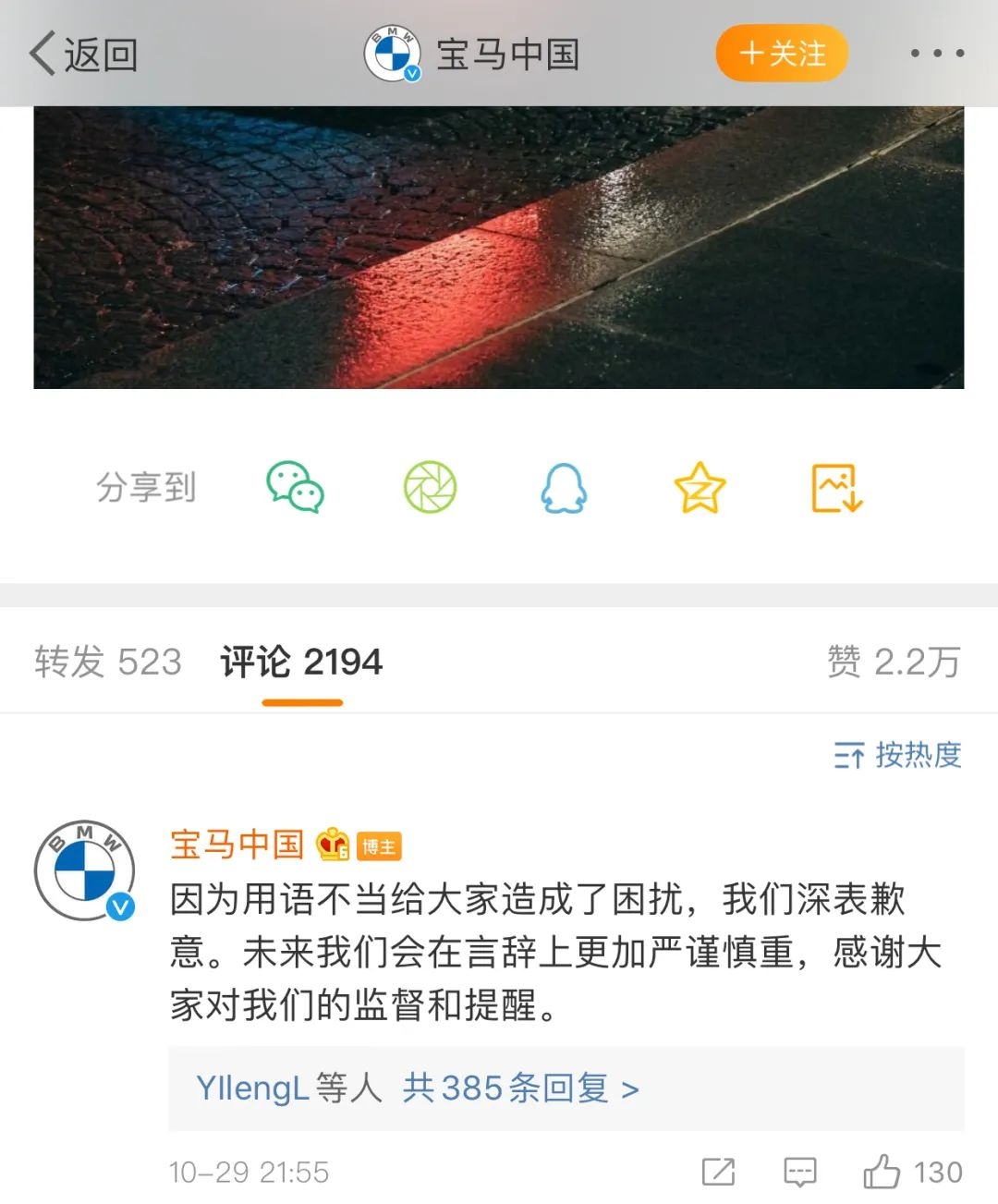 虽然,在收到网友的负面评论之后,宝马官方也置顶了一条道歉评论,对被冒犯到的网友表达了歉意。