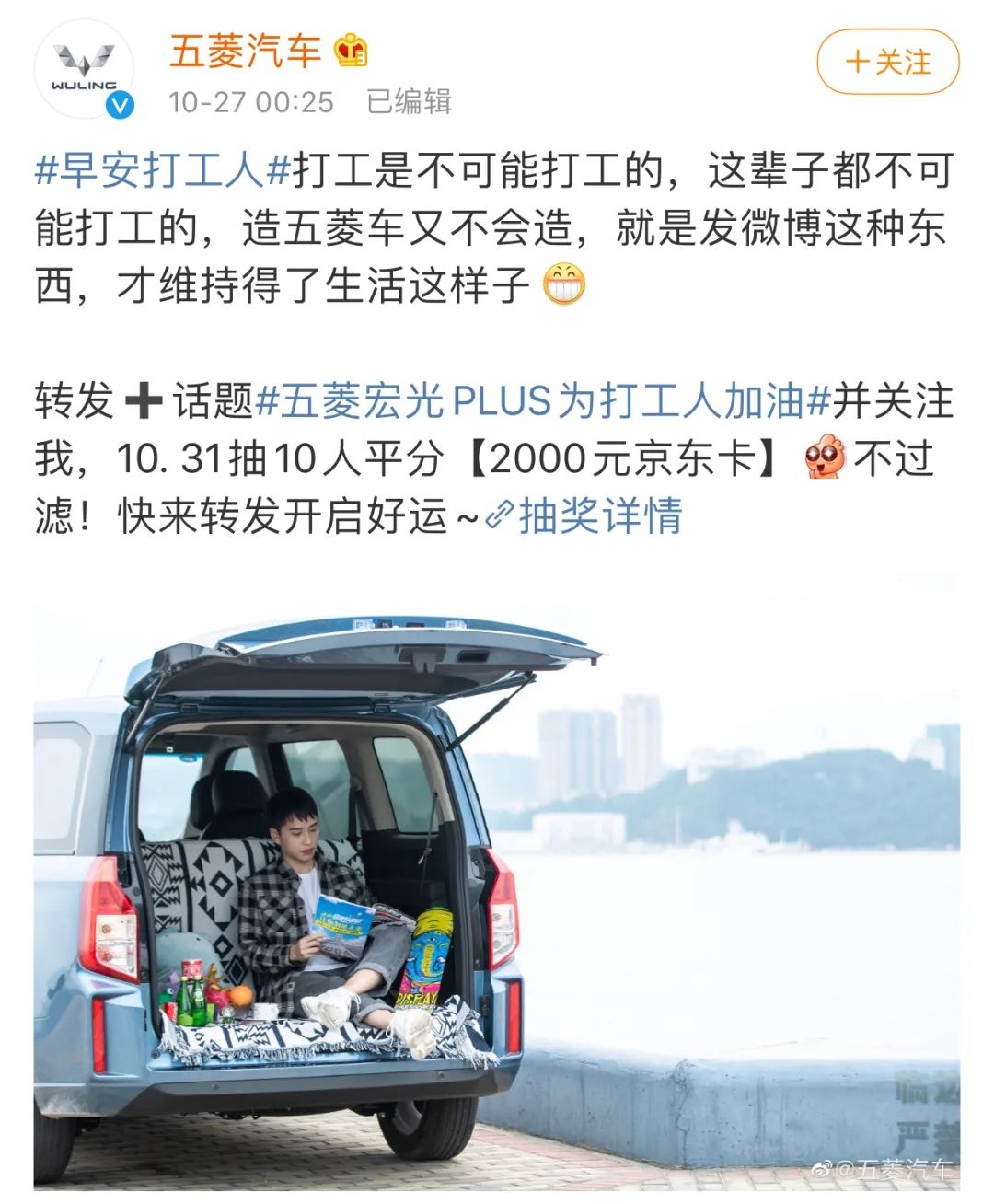 而对比之下,五菱汽车却对“打工人”所表达的社会意义做足了功课,提出“打工是不可能打工的”引起网友的共鸣,并借此做转发福利活动,增加网友的互动传播。除此之外,五菱汽车所表达的内容也符合其一直以来“亲近人民,接地气”的品牌人设,并以更年轻化的方式和用户进行了沟通。此时,品牌玩梗就是加分项。