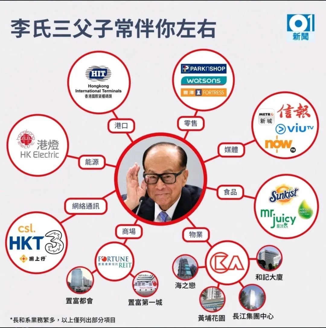 在香港,李嘉诚的产业占据、甚至垄断了很多行业……房地产、天燃气、电力、百货、零售等等。