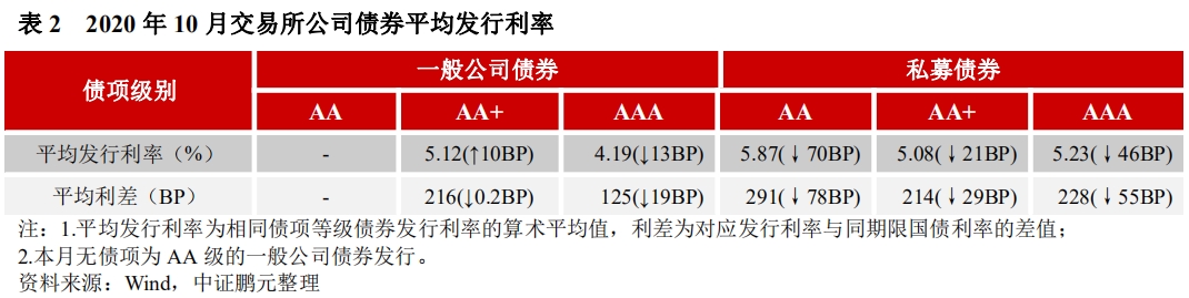 就发行利率而言,2020年10月份交易所公司债券的最高利率为9.00%,较上月最高利率上升50BP;最低发行利率为3.25%,较上月最低利率上升135BP。与2020年9月份相比,一般公司债券方面,AAA级平均发行利率下行13BP、利差收窄19BP,AA+级平均发行利率上行10BP,利差收窄0.2BP;私募债券方面,AAA级平均发行利率下行46BP、利差收窄55BP,AA+级平均发行利率下行21BP,利差收窄29BP,AA级均发行利率下行70BP、利差收窄78BP。