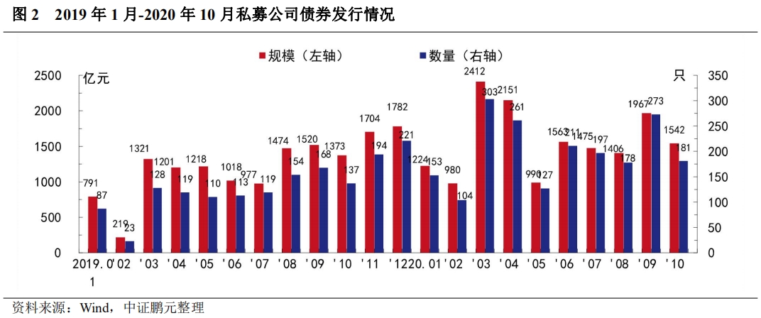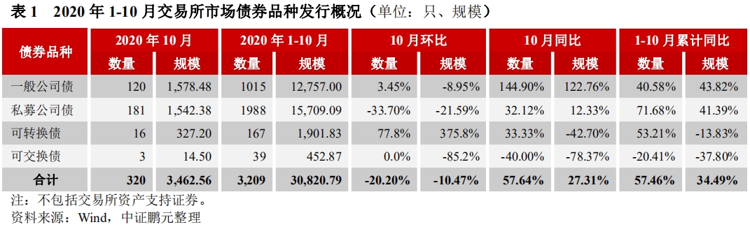 2020年10月份,交易所市场共发行信用债券320只,发行规模3,462.56亿元;发行数量和规模环比分别下降20%和10%,同比分别上升58%和27%。其中,一般公司债发行120只,发行规模1,578.48亿元,环比分别上升3%和下降9%,同比分别上升145%和123%;私募公司债发行181只,发行规模1,542.38亿元,环比分别下降34%和22%,同比分别上升32%和12%;可转债和可交换债分别发行16只和3只,发行规模分别为327.20亿元和14.50亿元。