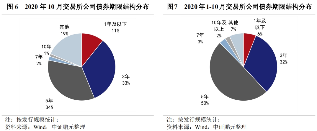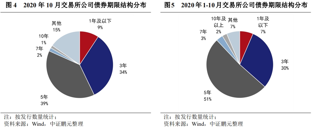 综合2020年1-10月份来看,3年期的交易所公司债券发行902只,累计发行规模1,541亿元,占比分别为30%和32%;5年期的交易所公司债券发行9,119.84只,累计发行规模14,092.12亿元,占比分别为51%和50%。分债券品种而言,1-10月份3年期和5年期一般公司债发行数量分别占比41%和39%,发行规模占比分别44%和36%;5年期私募债发行数量和发行规模分别占比58%和61%。