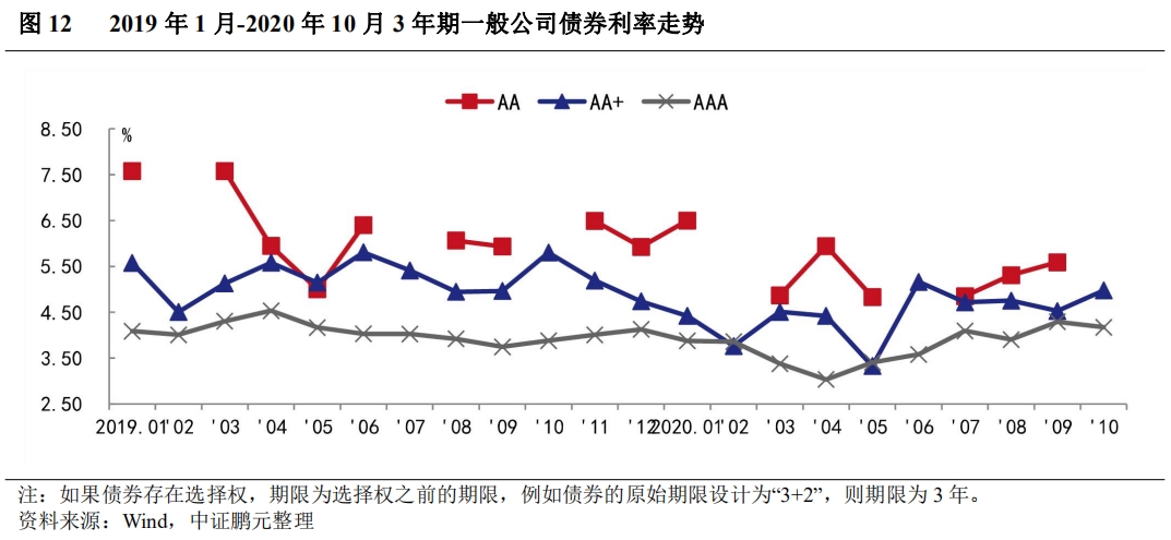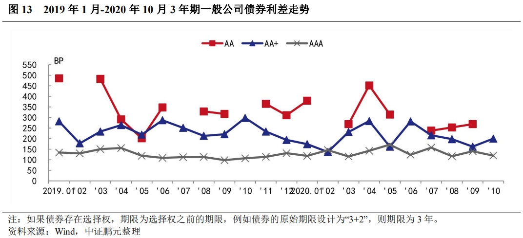 就3年期一般公司债券而言,与2020年9月份相比,10月份AAA级、AA+级、AA级发行平均利率分别上行39BP、下行22BP、上行28BP,平均利差分别扩大24BP、收窄36BP、扩大16BP。