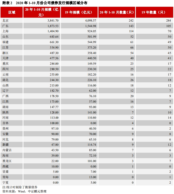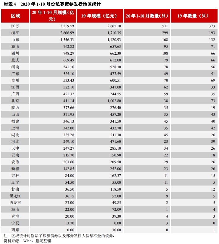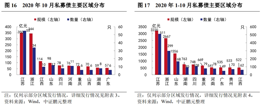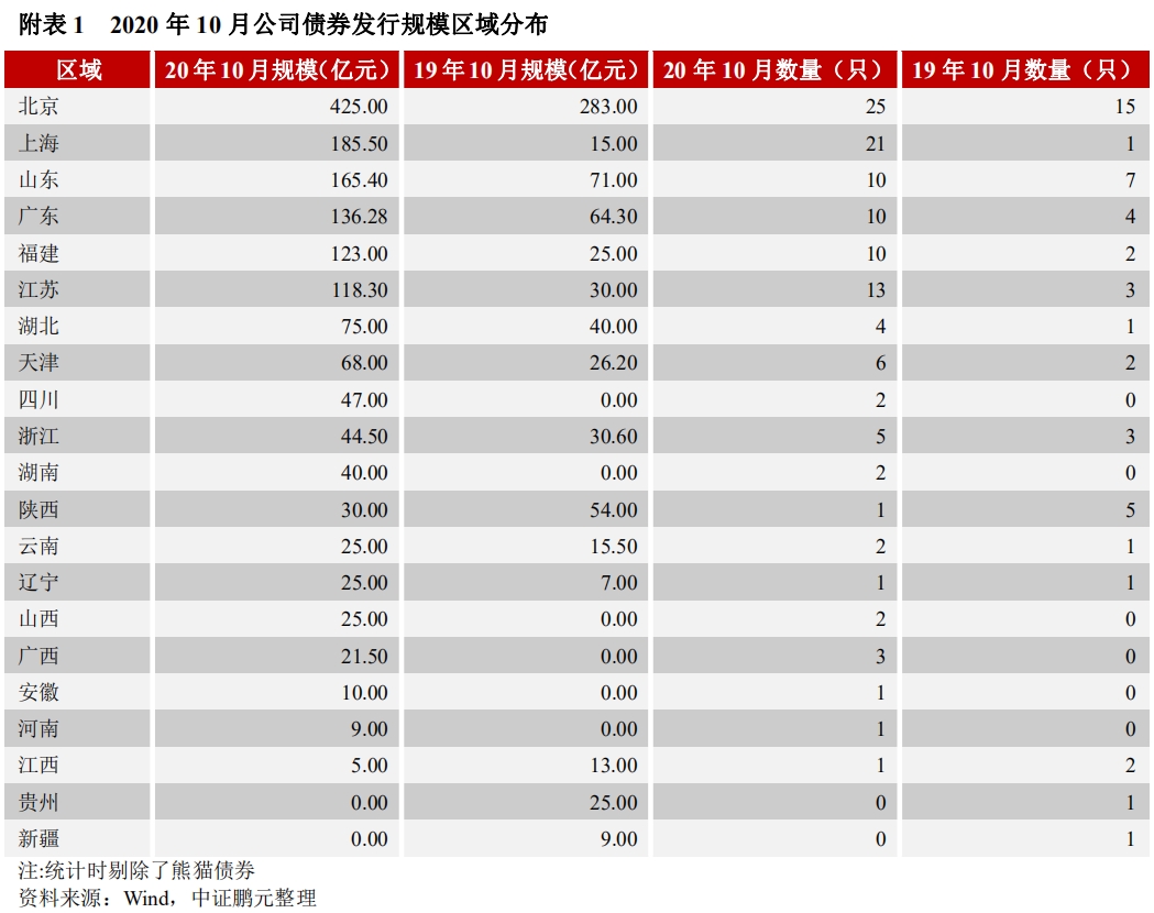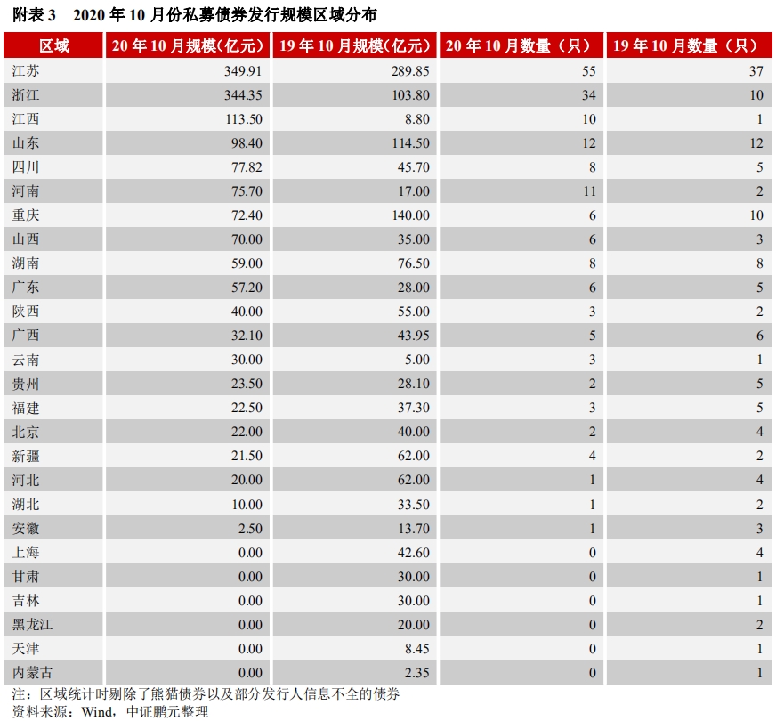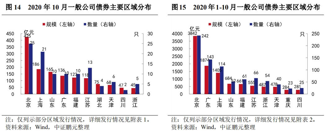 区域分布方面,10月份一般公司债券主要集中于北京、上海、山东等地,私募公司债券主要集中在江苏、浙江、江西等地。