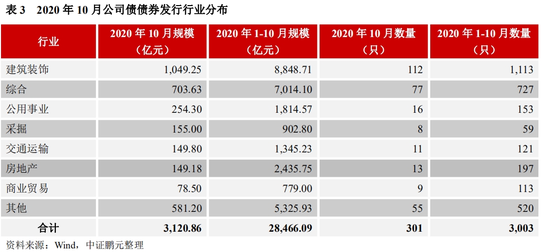 2020年10月份,交易所公司债券的发行人主要分布于建筑装饰和综合行业。具体来看,建筑装饰行业发行112只,占比37%,发行规模1,049.25亿元,占比34%,位居首位;其次是综合行业,发行77只,占比为26%,发行规模703.63亿元,占比23%。此外,房地产行业,发行13只,占比为4%,发行规模149.18亿元,占比5%,位于第六。综合2020年1-10月份的发行情况来看,建筑装饰和综合行业分别累计发行8,848.71亿元和8,848.71亿元位于前两位,远高于其他行业;房地产行业以累计发行2,435.75亿元,位于第三。