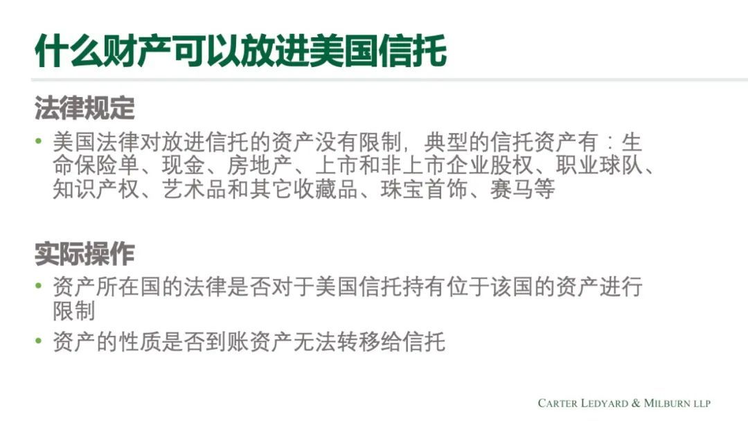 从法律层面来讲,美国法律允许任何国家的公民设立美国信托或设立持有美国资产的非美国信托。资金层面来看,美国对放进信托的资产规模及类型也没有很多限制,例如生命保险单、现金、房地产、企业股权等等均可放入美国信托内。