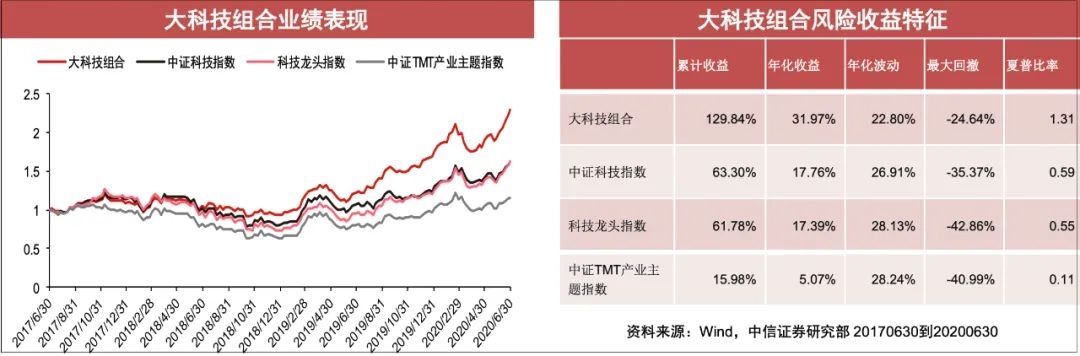 以中信证券研究部做的一个“大科技组合”研究案例进行说明,该组合挑选出4只同样都是科技风格的主动型基金。根据历史数据回测,2017年6月30日-2020年6月30日三年期间,“大科技组合”收益率129.84%,大幅跑赢中证科技指数、科技龙头指数、中证TMT产业主题指数,并且年化波动率和最大回撤率要更小(稳健)。组合里的四只基金分别是李德辉管理的上投摩根科技前沿灵活配置混合(001538)、胡宜斌管理的华安媒体互联网混合(001071)、李元博管理的富国创新科技混合(002692)、郑希管理的易方达信息产业混合(001513)。