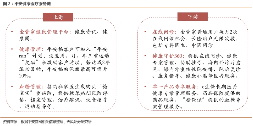 目前仅有友邦、平安等少数公司探索上游健康管理服务。平安为平安福客户提供“平安run”运动奖励计划,为客户定制个性化的短中长期运动计划,当客户达成运动目标后,可以获得和健康有关的奖励和保单保障额度的提升。平安针对糖尿病患者的重疾险“糖保保”提供血糖管理服务,包括糖尿病AI风险评估、档案管理、治疗建议、饮食指导、运动指导等多项服务,帮助被保险人提升健康状况、防止或延缓糖尿病严重并发症的发生。友邦的“健康友行”计划与“平安run”类似,重疾险及高端医疗险客户可以加入,“健康友行”计划着眼于客户的日常健康生活管理,通过步数和睡眠的监测追踪、健康知识问答互动以及丰富的任务卡与积分累积奖励等,帮助客户在体验和分享中养成健康生活的良好习惯。