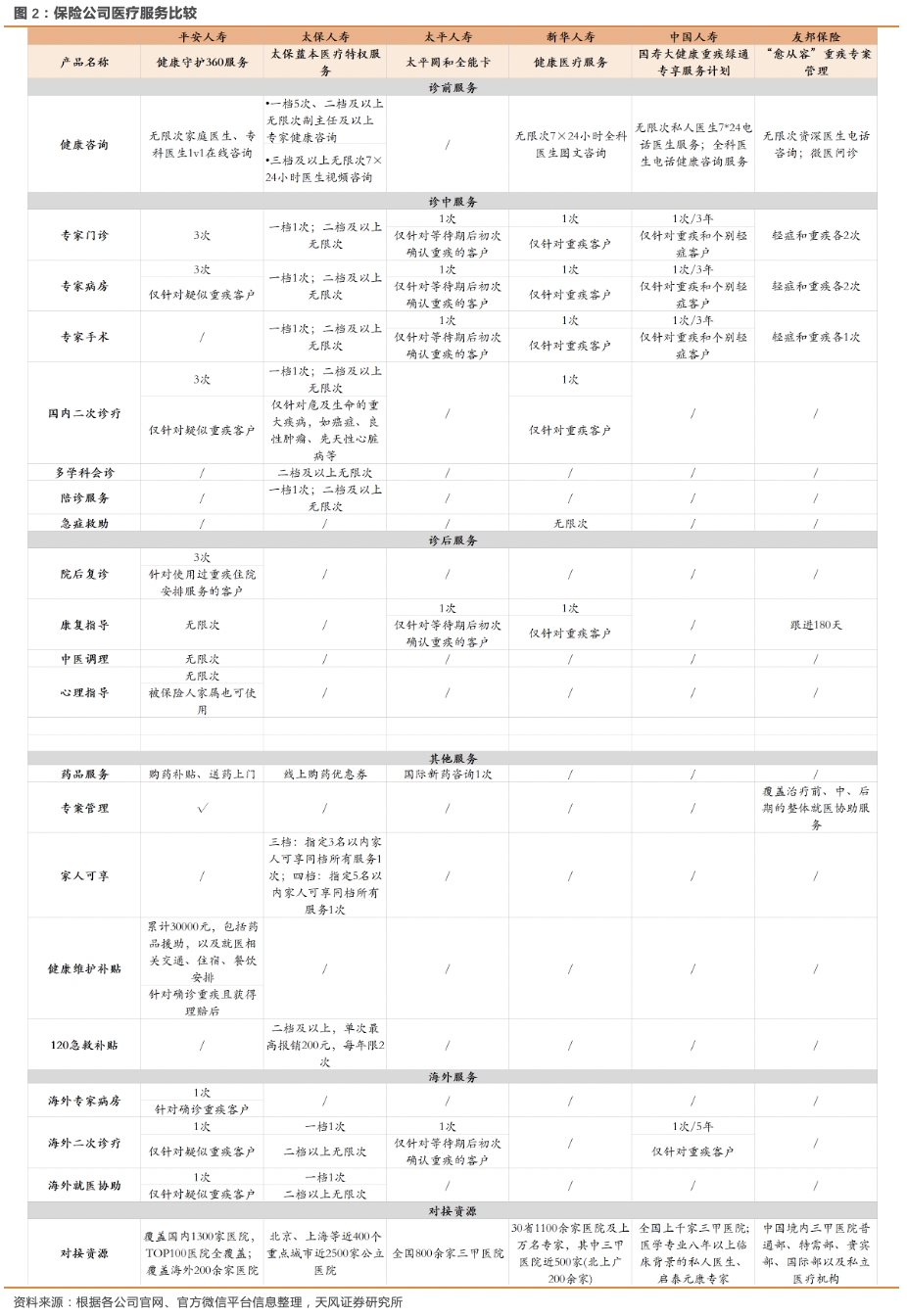 多数公司的健康医疗服务主要聚焦在下游的医疗端,为符合一定标准的客户提供门诊预约、病房安排、手术安排、二次诊疗等就医绿通服务,目前各大公司均有提供,但提供的程度有所差异。后文将从诊前、诊中、诊后来对比各公司提供的医疗服务。