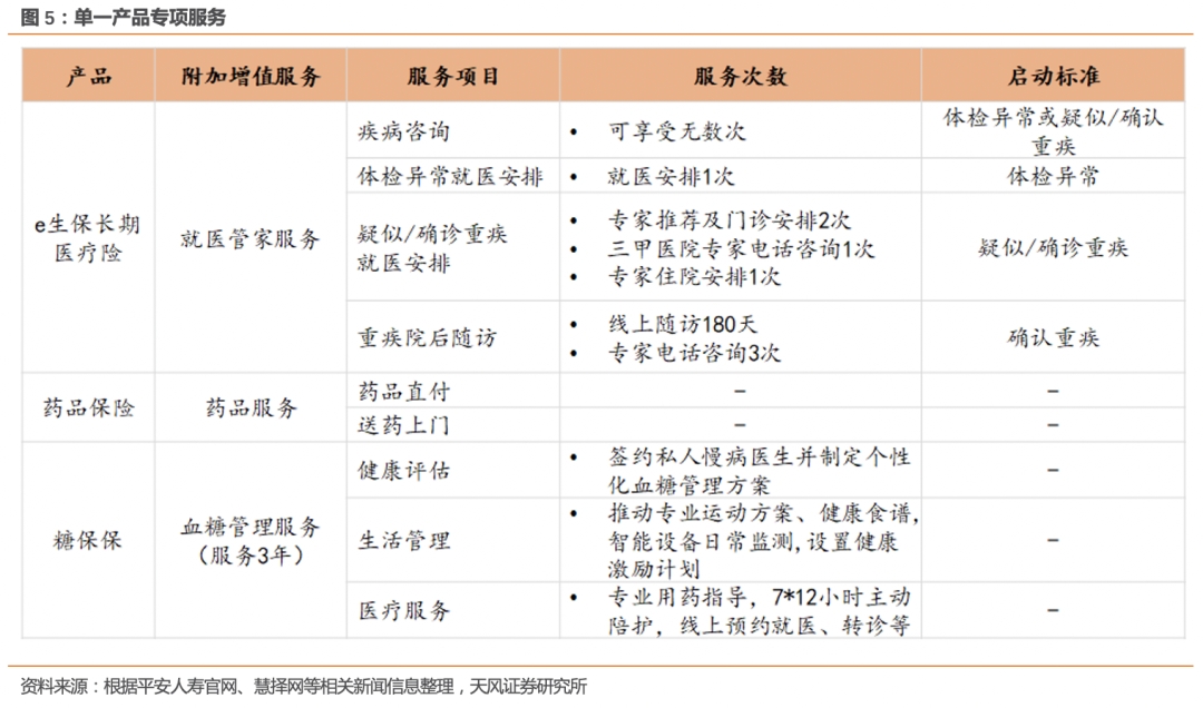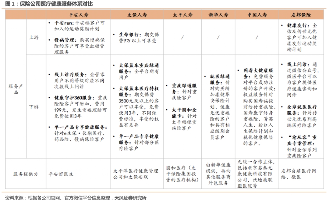 大型公司均已开始探索将医疗健康服务与保险产品相结合。医疗健康服务和保险密切相关,健康险+医疗健康服务可以构成“上游健康预防,中游经济补偿,下游医疗服务”的服务链,切合客户对于健康的需求。上游健康预防包括健康风险评估和干预、疾病预防、健康体检、运动激励计划、健康档案管理、健康维护、慢性病管理、养生保健等服务,下游医疗服务包括就医预约与安排、陪诊服务、专案管理、购药福利、康复护理等绿通服务。