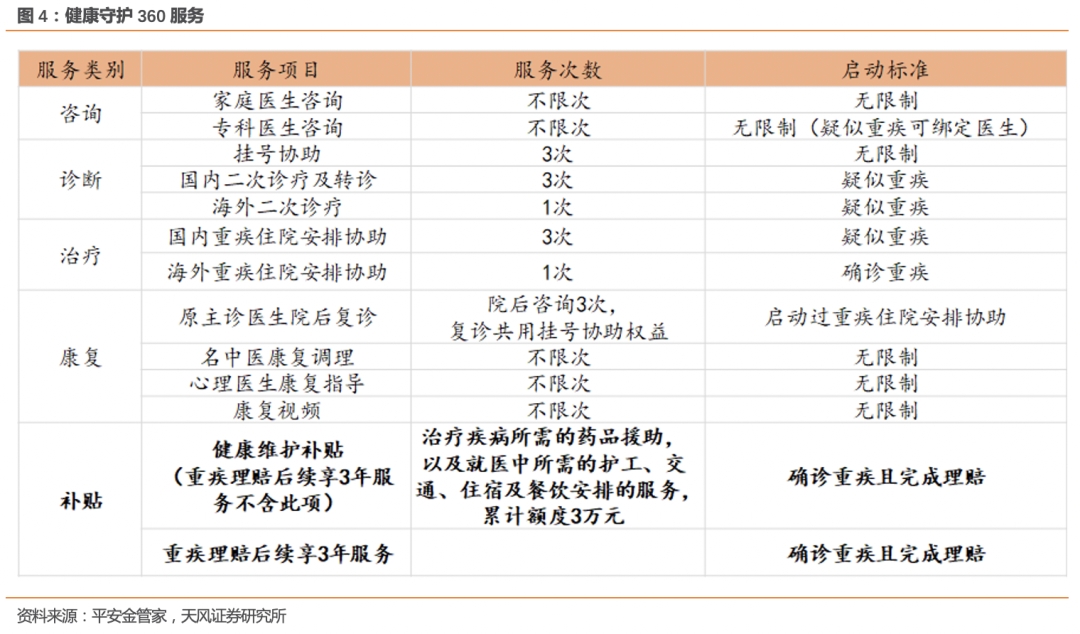 平安寿险借助平安好医生的在线医疗平台,已经初步搭建了“上游健康预防,中游经济补偿,下游医疗服务”的线上+线下相结合的完整服务链。其中,“健康守护360服务”是针对重疾险客户提供的医疗服务,由平安好医生提供和管理,重疾险客户可购买,费用为199元/年。服务相较于其他内地公司更为全面,覆盖诊前、诊中、诊后的国内外医疗服务,且提供3万元重疾补贴。除此之外,平安还针对部分医疗险、药品险、慢病保险提供专属的健康服务,提升产品吸引力。