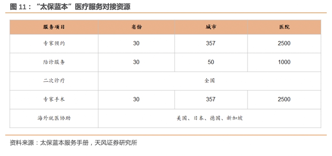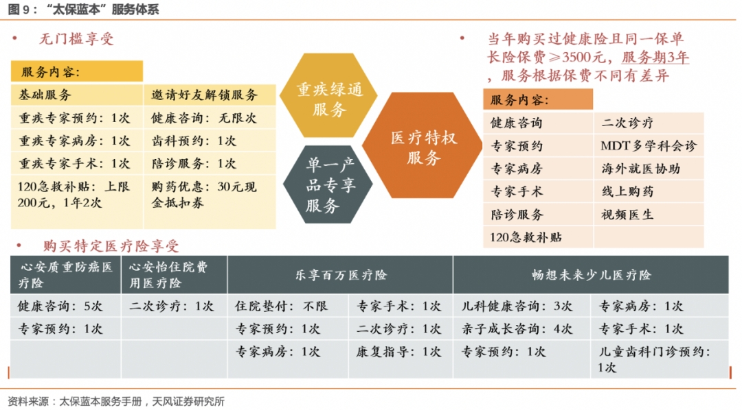 “太保蓝本”是“保险+健康”服务生态圈的重要载体,自2019年推出以来,已累计覆盖约1000万人。“太保蓝本”打造的多层次的医疗服务体系包括:1、无门槛即可享受的重疾绿通服务,作为代理人获客工具;2、特定医疗险享受的服务,提升客户从短险向长险的转化;3、长险客户可享受的医疗特权服务,有助于推动长险件均的提升及客户加保。其中,太保蓝本医疗特权服务提供升级版的医疗服务,为不同保费级别的客户提供覆盖诊前、诊中、诊后的医疗协助服务。