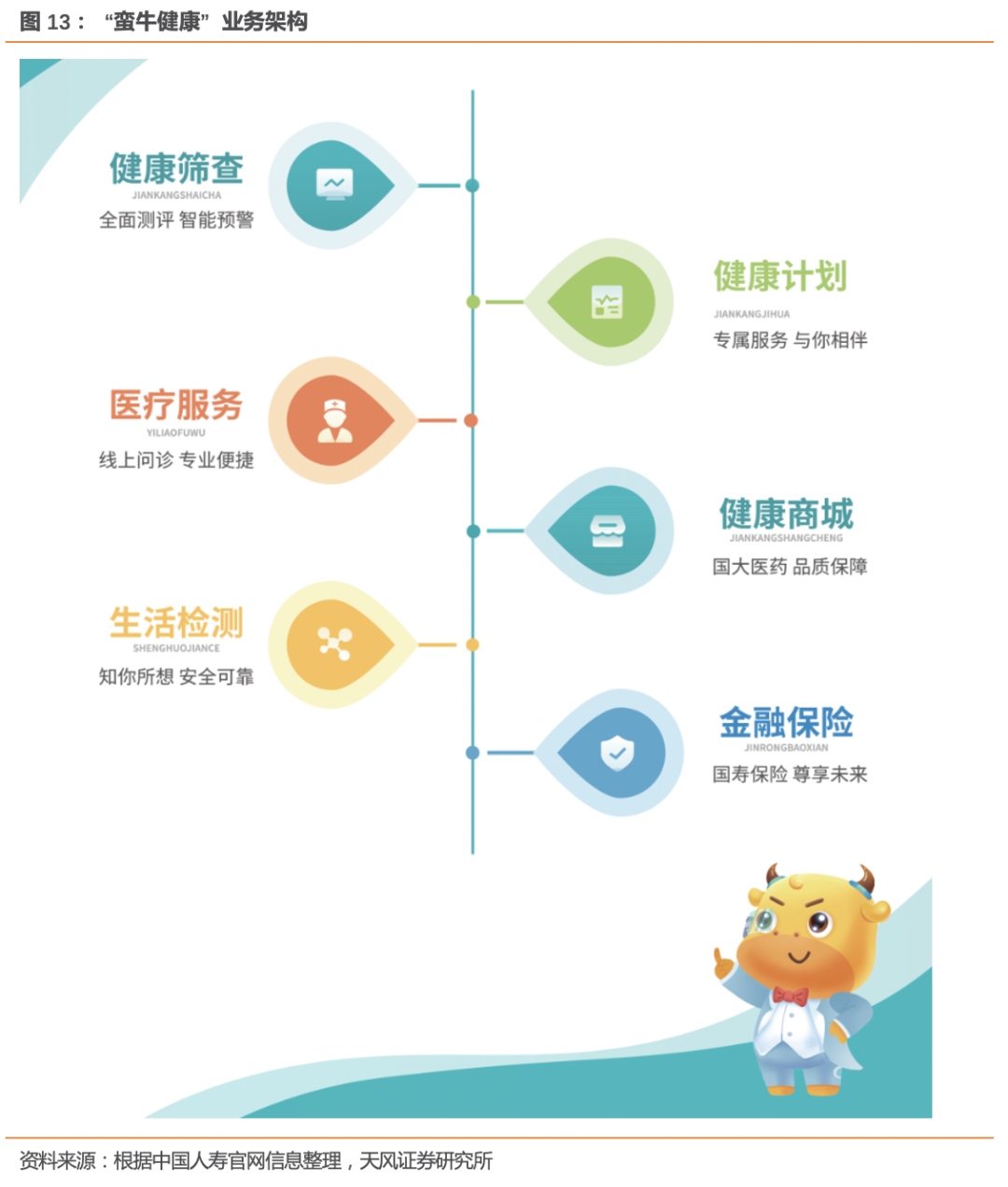 “服务赋能”是太保转型2.0的重要方向之一,太保致力于打造“保险+健康+养老”生态圈,其中,“太保蓝本”医疗服务、“太保妙健康”健康互动计划、“CWI健康体验中心”智能健康管家构成面向客户的“保险+健康”生态圈,助力客户健康服务增值。目前“太保蓝本”已全面向队伍推动,植入代理人标准销售流程,成为获客的重要工具;其他两个项目还处于总体布局阶段。