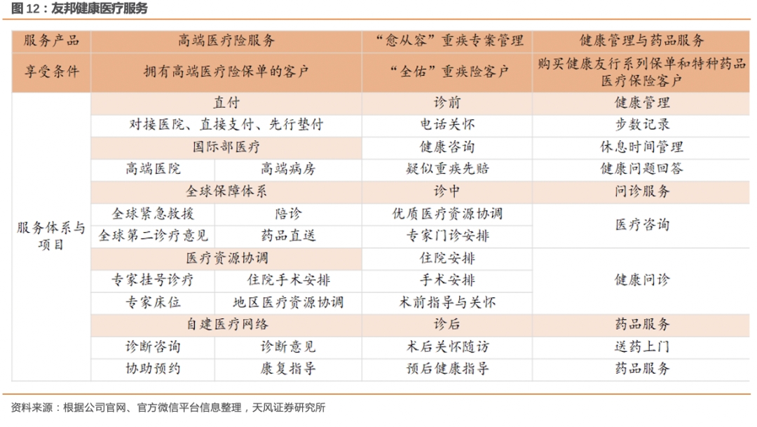 平安、太保、友邦“产品+服务”的布局走在前列。目前平安、太保、友邦的差异化服务体系构建得更加完善,新华、国寿还处于初始布局阶段。①健康医疗服务:平安、太保、友邦提供的服务基本呈体系化。在上游健康管理端,仅有友邦、平安等少数公司进行布局,如友邦的“健康友行”和“平安run”运动奖励计划、平安的血糖管理服务。多数公司的健康医疗服务主要聚焦在下游的医疗端,为符合一定标准的客户提供门诊预约、病房安排、手术安排、二次诊疗等就医绿通服务,即主要为诊中服务。整体来看,平安提供的医疗服务较为完善,覆盖诊前、诊中、诊后、海外医疗服务,以及一些特色服务项目(如3万就医补贴),而友邦的服务更倾向于面向高端医疗客户,重疾险客户所享受的服务更加精简,体现了重疾专案管理的理念,在诊前、诊中、诊后给予客户就医提示和建议;太保提供诊中服务的力度较强(启用标准低、服务次数多)。如综合考虑服务的可得性,太保的服务吸引力相对更强,平安较为完善的服务需要付费购买。在服务供应方面,平安、太保、友邦由公司自建医疗网络或子公司提供服务,可以更好地保证服务质量,国寿、新华提供的服务则由零散的外包服务供应商提供,服务较碎片化。另外,能否将差异化的服务引入销售前线,使其成为代理人获客、经营客户的工具亦十分重要。友邦、太保的代理人已将健康医疗服务的推介纳入为标准化销售流程中的重要一环,而其他公司目前在销售环节中并未过多强调差异化的服务。②养老产业:除友邦外,各公司均在布局养老产业,以助力高端客户经营。其中,太平、国寿、新华有养老社区实体建成,其中太平养老社区产生了一定的销售带动作用,新华养老社区入住权未与保险产品挂钩。太保、平安还未有养老社区建成,但太保养老社区也已产生了一定的销售带动作用,平安预计于明年将养老社区与年金险结合。③VIP服务:目前大型公司VIP权益主要包括体检服务、就医服务、急难救助、医疗关怀等,相对于普通客户的健康医疗服务,增加了体检服务、特需高端医疗安排、急难救助、就医关怀等升级服务。平安、太保、友邦的VIP服务相对更加丰富,除上述服务外,还提供了机场贵宾、商旅娱乐协助等生活服务。友邦服务更能凸显差异化以及更切合高净值人群的需求,即提供了法律、税务服务。