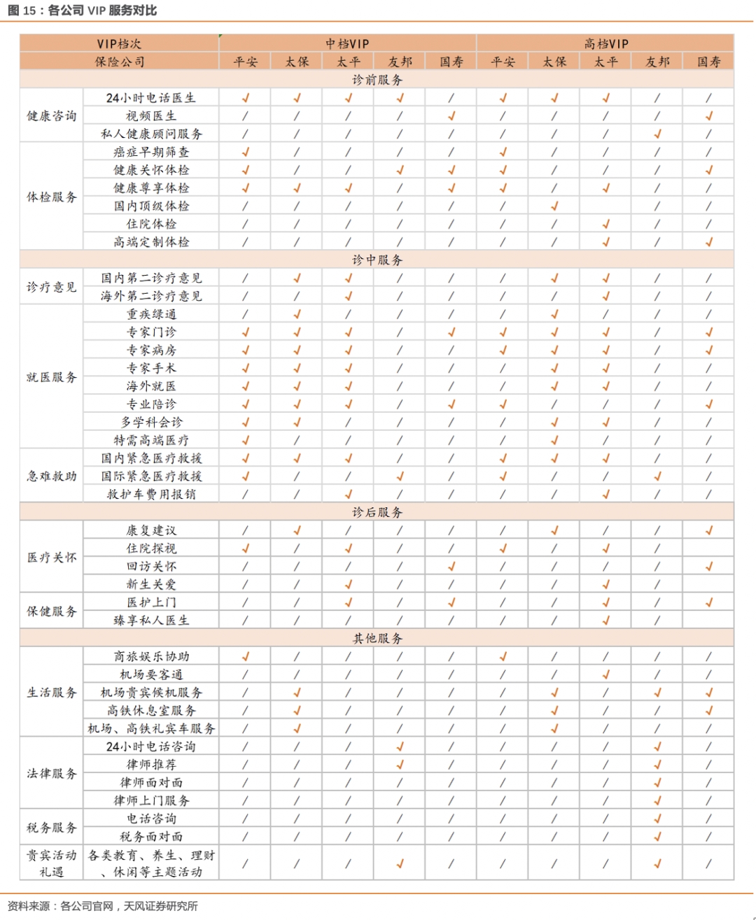 VIP服务是保险公司为满足一定保费标准的客户提供的差异化、分层次的服务。目前大型公司VIP权益主要包括体检服务、就医服务、急难救助、医疗关怀等,相对于普通客户的健康医疗服务,增加了体检服务、特需高端医疗安排、急难救助、就医关怀等升级服务。平安、太保、友邦的服务相对更加丰富,除上述服务之外,还提供了机场贵宾、商旅娱乐协助等生活服务。友邦的服务更能凸显差异化以及更切合高净值人群的需求,即友邦提供了法律、税务服务。