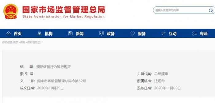 11月5日,市场监管总局规范促销行为,公布《规范促销行为暂行规定》:其中规定,经营者折价、减价,应当标明或者通过其他方便消费者认知的方式表明折价、减价的基准。通过积分、礼券、兑换券、代金券等折抵价款的,应当以显著方式标明或者通过店堂告示等方式公开折价计算的具体办法。
