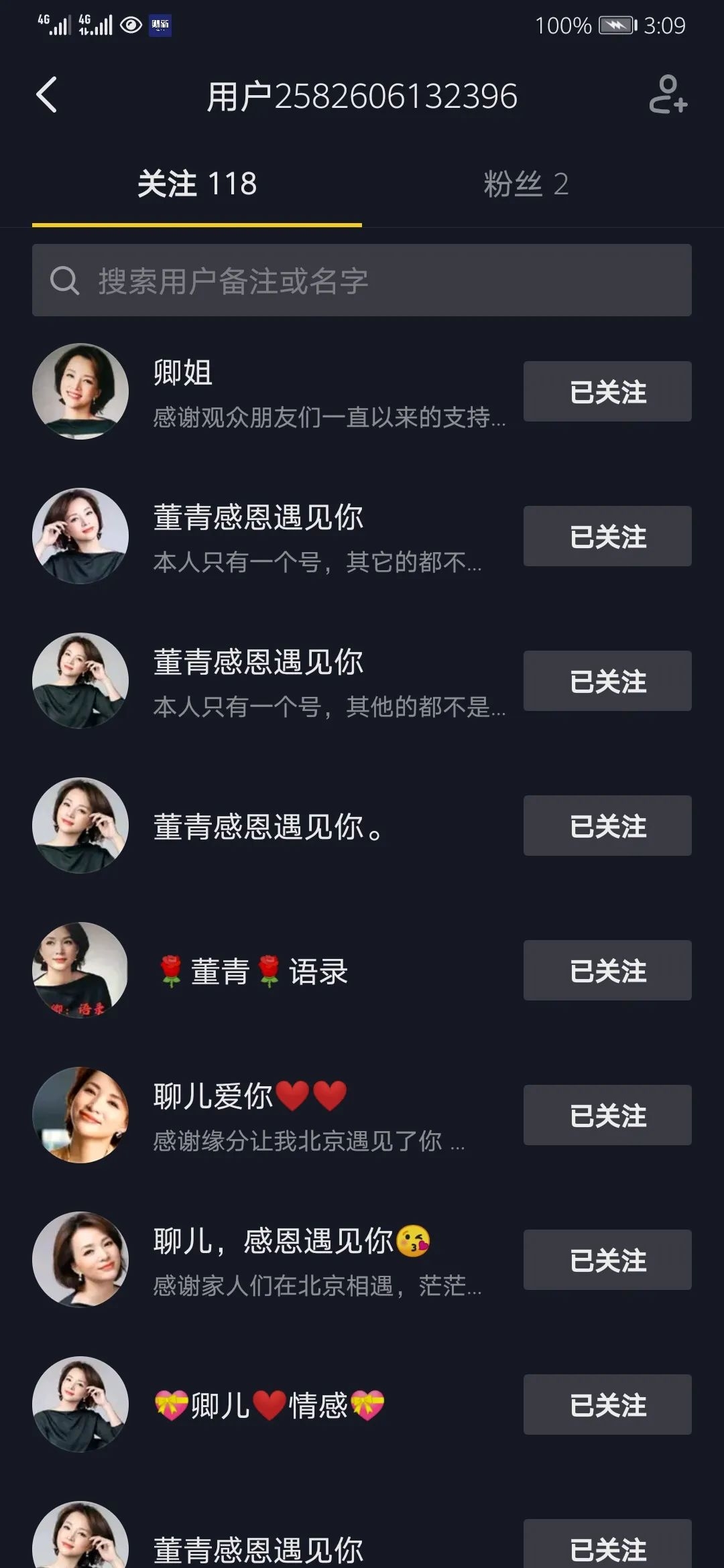 老李关注的90多个假董卿账号,分为两类,一类是每天对粉丝嘘寒问暖,另一类是分享成功励志、情感交流等正能量语录。