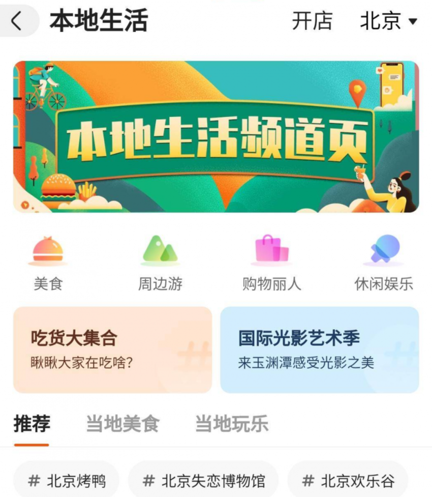 今年7月,快手在“更多功能”中上线了“本地生活”,开设“美食”、“周边游”、“购物丽人”、“休闲娱乐”四大频道,为本地服务门店导流,获得更多变现空间。