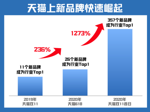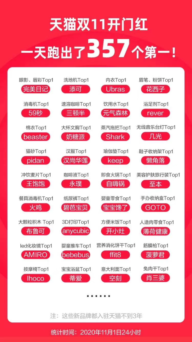 据天猫数据显示,11月1日当天,1800多个新品牌成交额超越去年双11全天,94个新品牌增长超过1000%,357个新品牌成为行业top1。