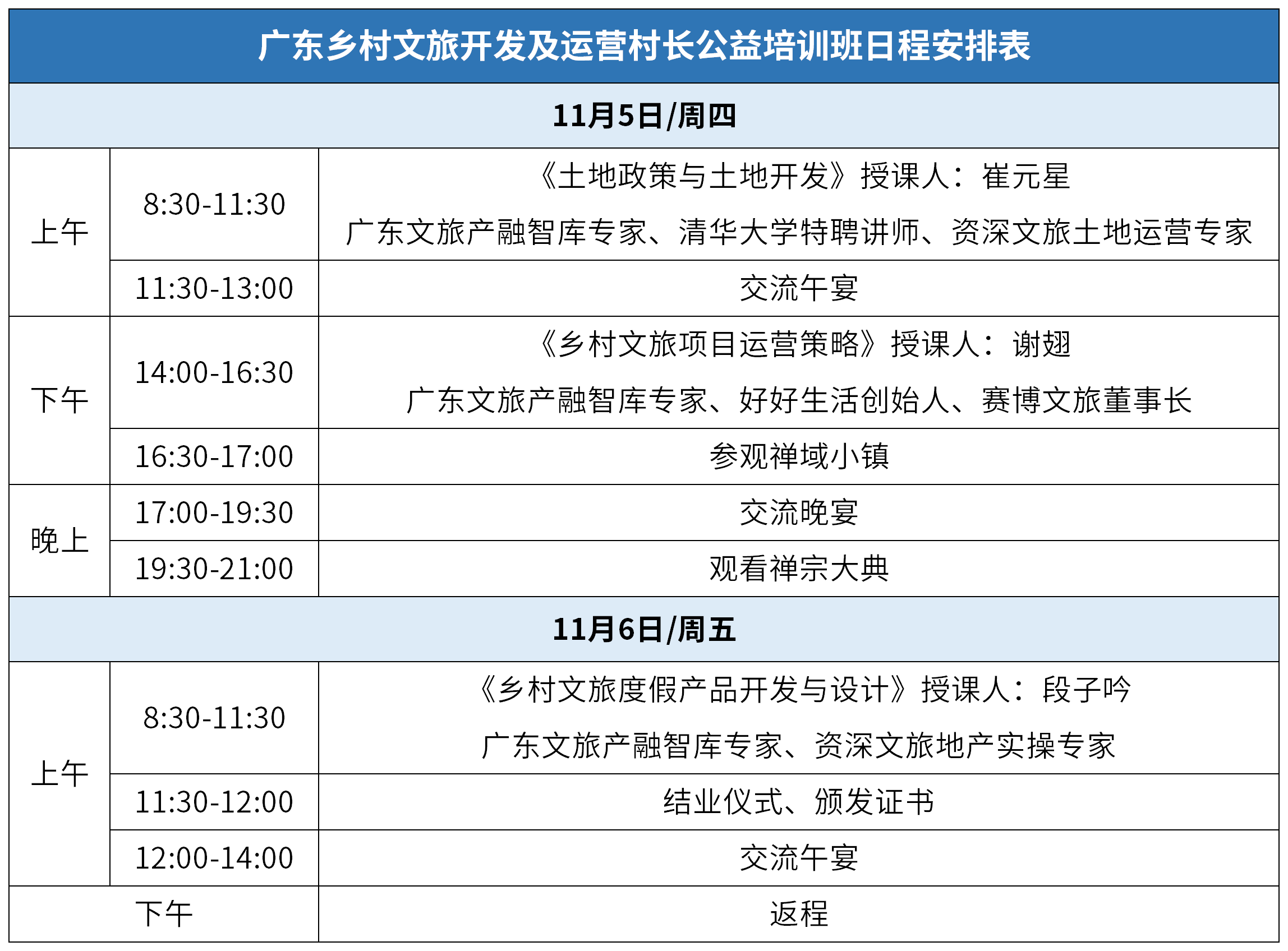 据了解,为期3天的公益培训班邀请了崔元星、谢翅、段子吟等多位广东文旅产融智库专家分别讲授《土地政策与土地开发》、《乡村文旅项目运营策略》、《乡村文旅度假产品开发与设计》等课程。课程之外,学员们还将实地考察禅域小镇、观看大型实景演出《六祖大典》,将课堂与实际相结合,多维度探讨乡村文旅开发与运营。