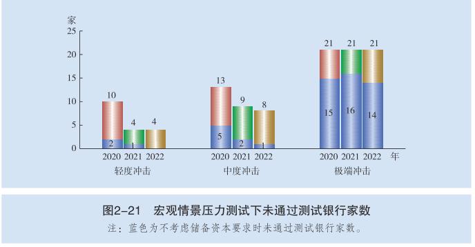 参试银行个体风险抵御能力有所差异。在轻度、中度、极端冲击下,2020年末分别有10家、13家、21家银行未通过测试,经由两年的利润留存补充资本,2022年末轻度和中度冲击下未通过测试银行家数将分别降至4家和8家,极端冲击下,未通过测试的银行仅靠利润留存无法满足资本充足率的监管要求。若不考虑2.5%的储备资本要求,在轻度、中度和极端冲击下,2020年末未通过测试的银行家数将分别降至2家、5家和15家。