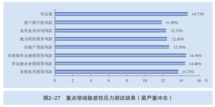 客户集中度、表外业务、地方政府债务、房地产贷款等领域风险值得关注。若最大5家非同业集团客户违约(损失率60%),参试银行整体资本充足率下降至11.89%,下降2.84个百分点。若15%的表外业务发生垫款(保证金比例50%),参试银行整体资本充足率下降至12.33%,下降2.40个百分点。若地方政府债务相关资产不良率上升15个百分点,参试银行整体资本充足率下降至12.45%,下降2.28个百分点。若房地产开发贷款不良率增加15个百分点、购房贷款不良率增加10个百分点,参试银行整体资本充足率下降至12.7%,下降2.03个百分点。
