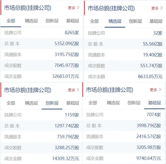 新三板挂牌公司总计8265家(精选层32家,创新层1159家,基础层7074家),总股本5352.09亿股,流通股本3195.75亿股。