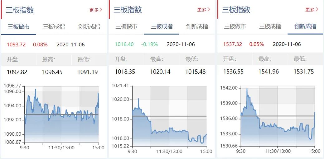 截至11月6日收盘,三板做市报1093.72点,上涨0.08%;三板成指报1016.40点,下跌0.19%;三板创新成指报1537.32点,上涨0.05%。