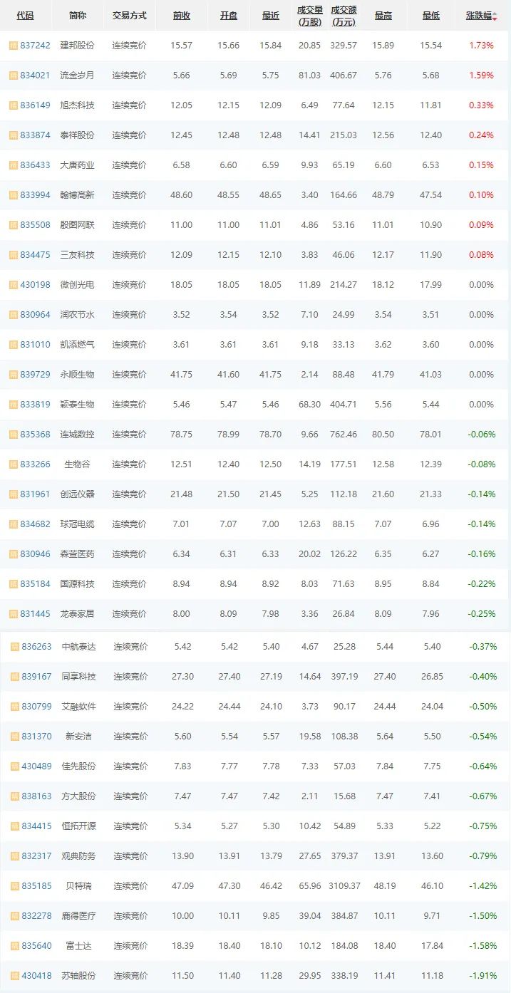 11月6日,精选层普跌,32家企业8家涨,5家平盘,19家跌;其中,建邦股份(837242)涨幅居首,上涨1.73%;其次,流金岁月(834021)上涨1.59%;苏轴股份(430418)下跌1.91%,跌幅居首;富士达(835640)下跌1.58%居次;微创光电(430198)、润荣节水(830964)等平盘。