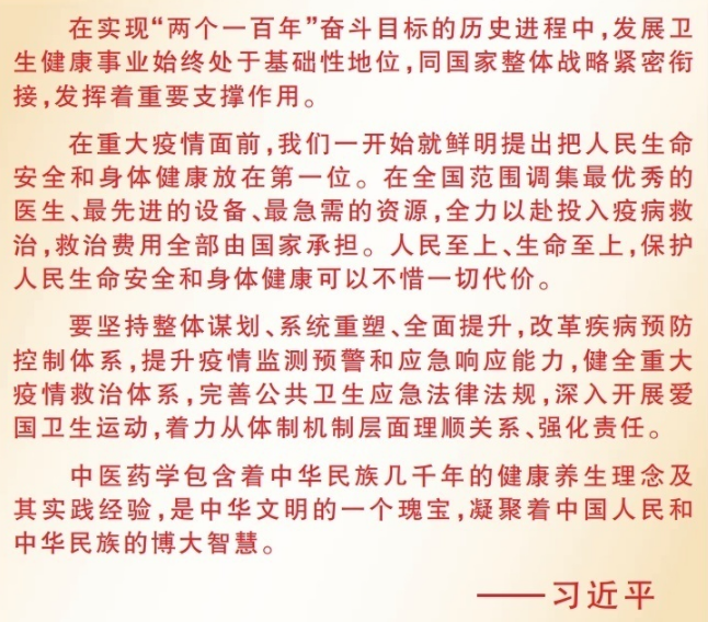 人民至上、生命至上。习近平总书记十分关心卫生与健康事业,亲自谋划、亲自推动健康中国建设,把人民健康放在优先发展的战略地位,全方位、全周期保障人民健康,为实现中华民族伟大复兴的中国梦奠定了坚实的健康基石。