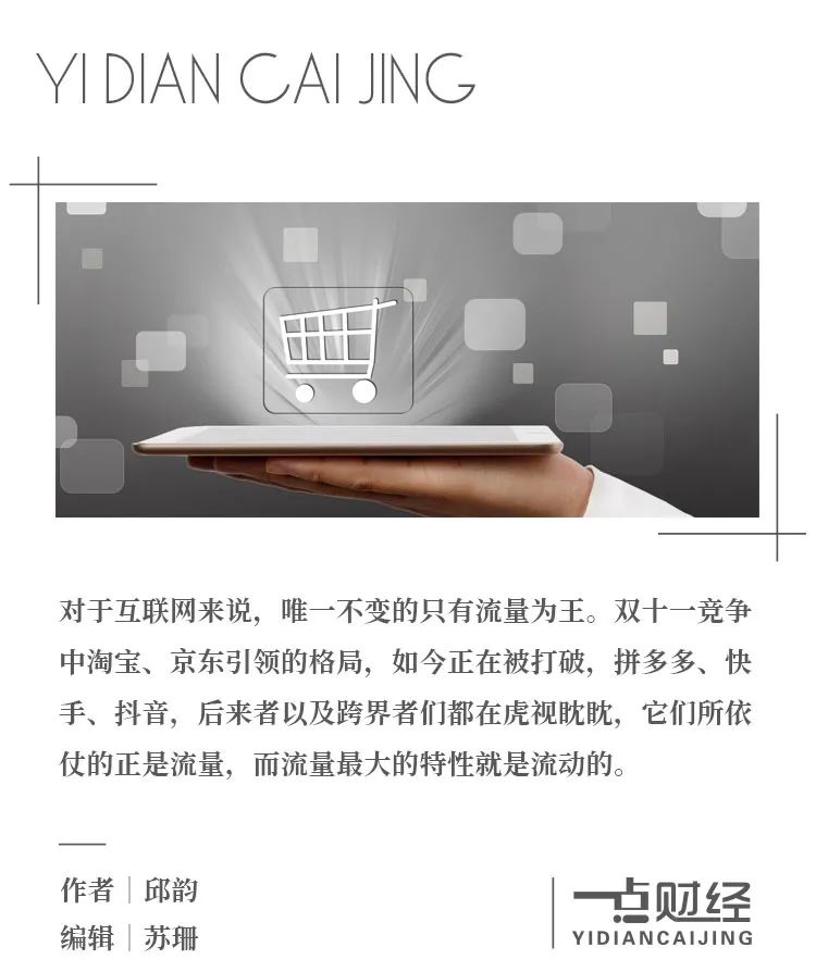 对商业来说,唯一不变的只有变化本身。对于互联网来说,还需要增加一条,唯一不变的只有流量为王。双十一竞争中淘宝、京东引领的格局,如今正在被打破,拼多多、快手、抖音,后来者以及跨界者们都在虎视眈眈,它们所依仗的正是流量,而流量最大的特性就是流动的。