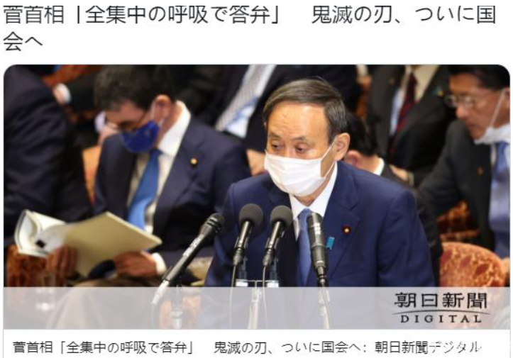 11月2日,在众院预算委员会上,日本首相菅义伟引用了《鬼灭之刃》中主人公的必杀技“全集中呼吸”,答复了政敌的提问。