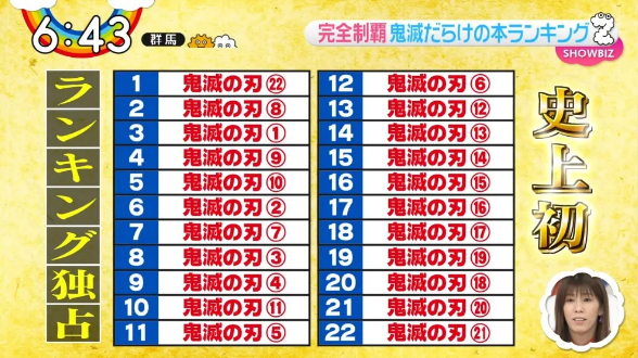 据日本Oricon公信榜统计,《鬼灭之刃》是2019年全日本最畅销的漫画。截至今年9月,《鬼灭之刃》漫画的累积销量已经突破1亿,不仅成为近年来超越《海贼王》漫画销量的第一部作品,还独占漫画销量周榜第1~22位的作品——之所以只占了前22位,是因为《鬼灭之刃》到22卷就完结了。