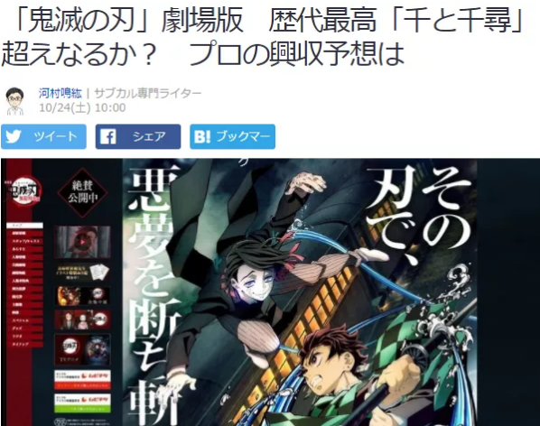 至今,《千与千寻》的票房依旧无人撼动。“鬼灭”狂飙突进的票房,让日媒以“《鬼灭之刃》剧场版能否超越《千与千寻》?”为题进行了种种讨论。其中一个猜测是:如果《鬼灭之刃》票房登顶,是否预示着日本动画新时代的到来?